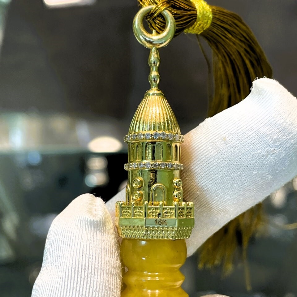 Минарет выполнен из желтого золота 750(18К) пробы и инкрустацией россыпью мелких белоснежных бриллиантов и украшен кисточкой.