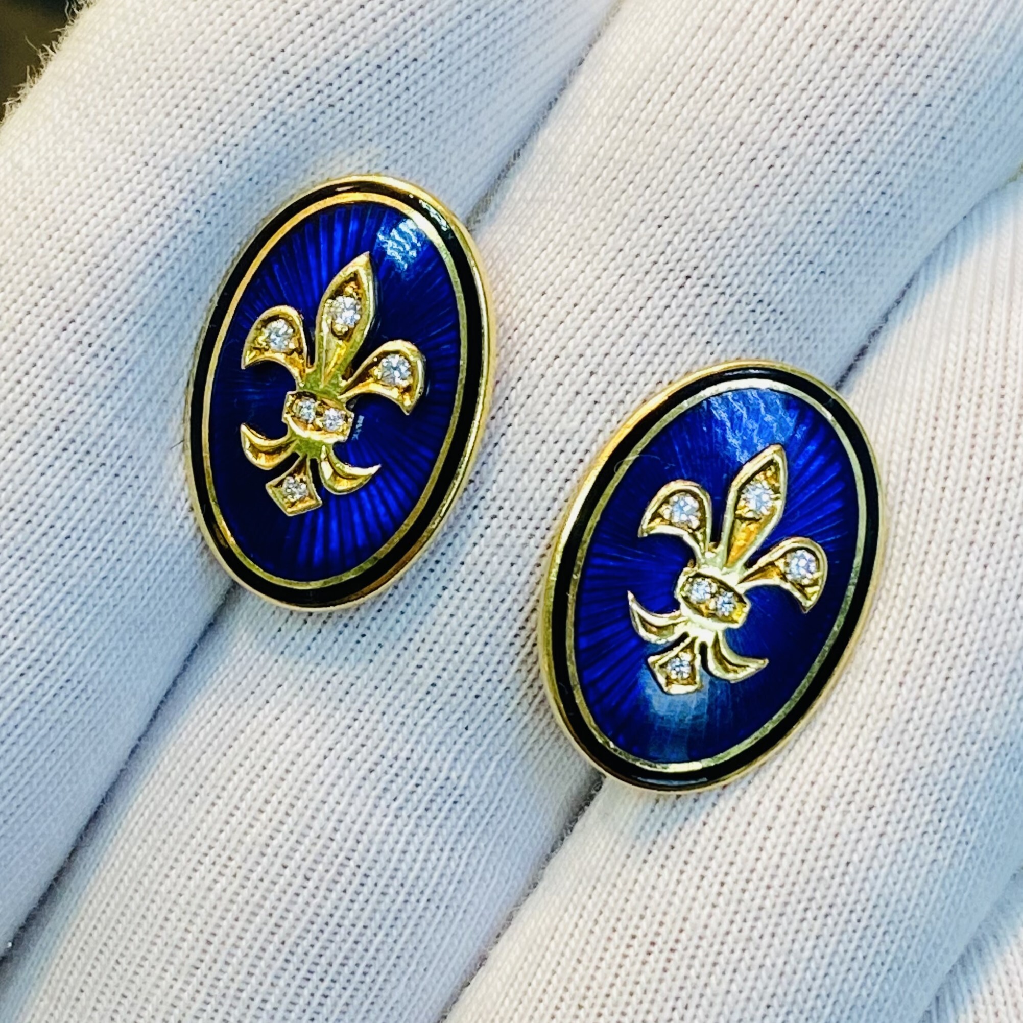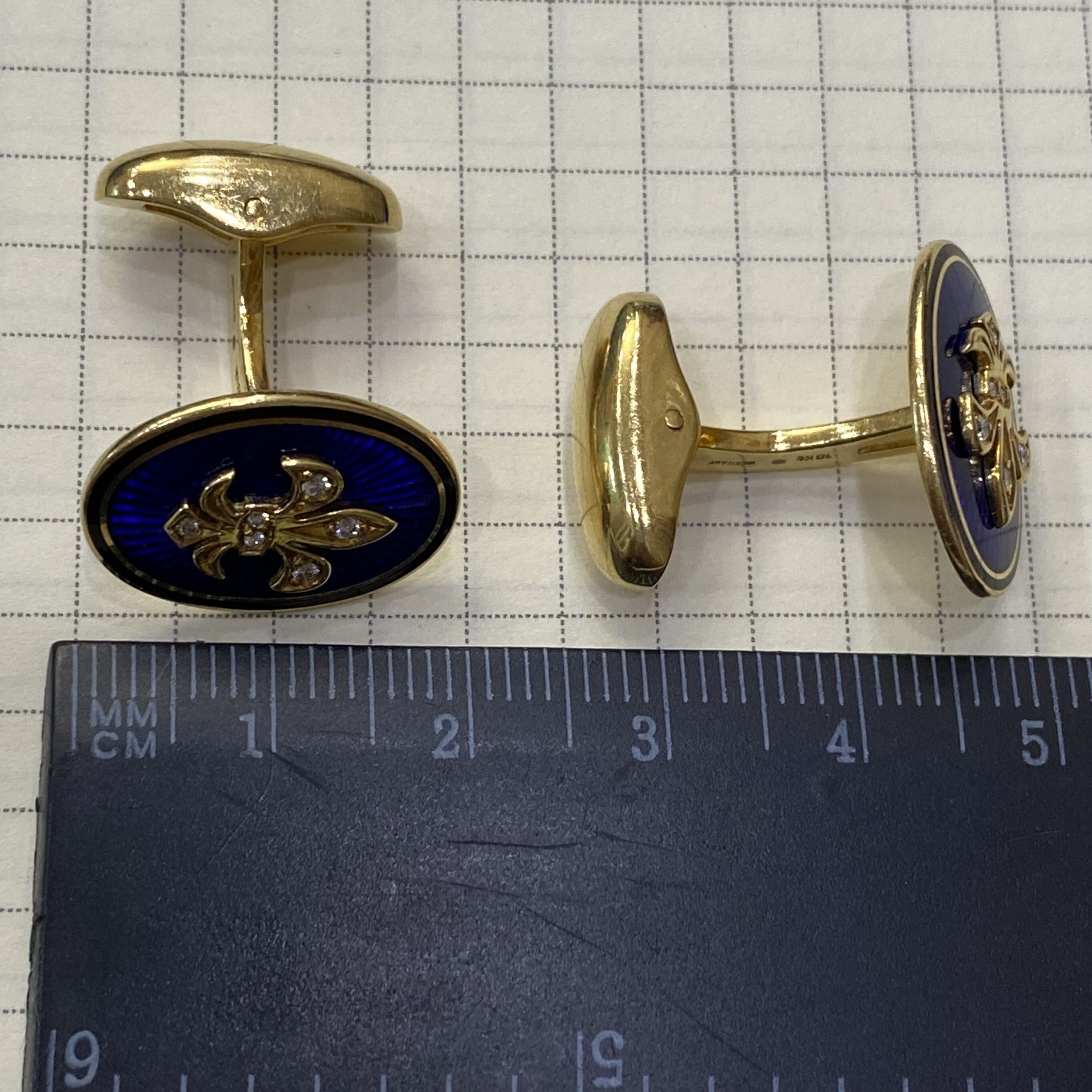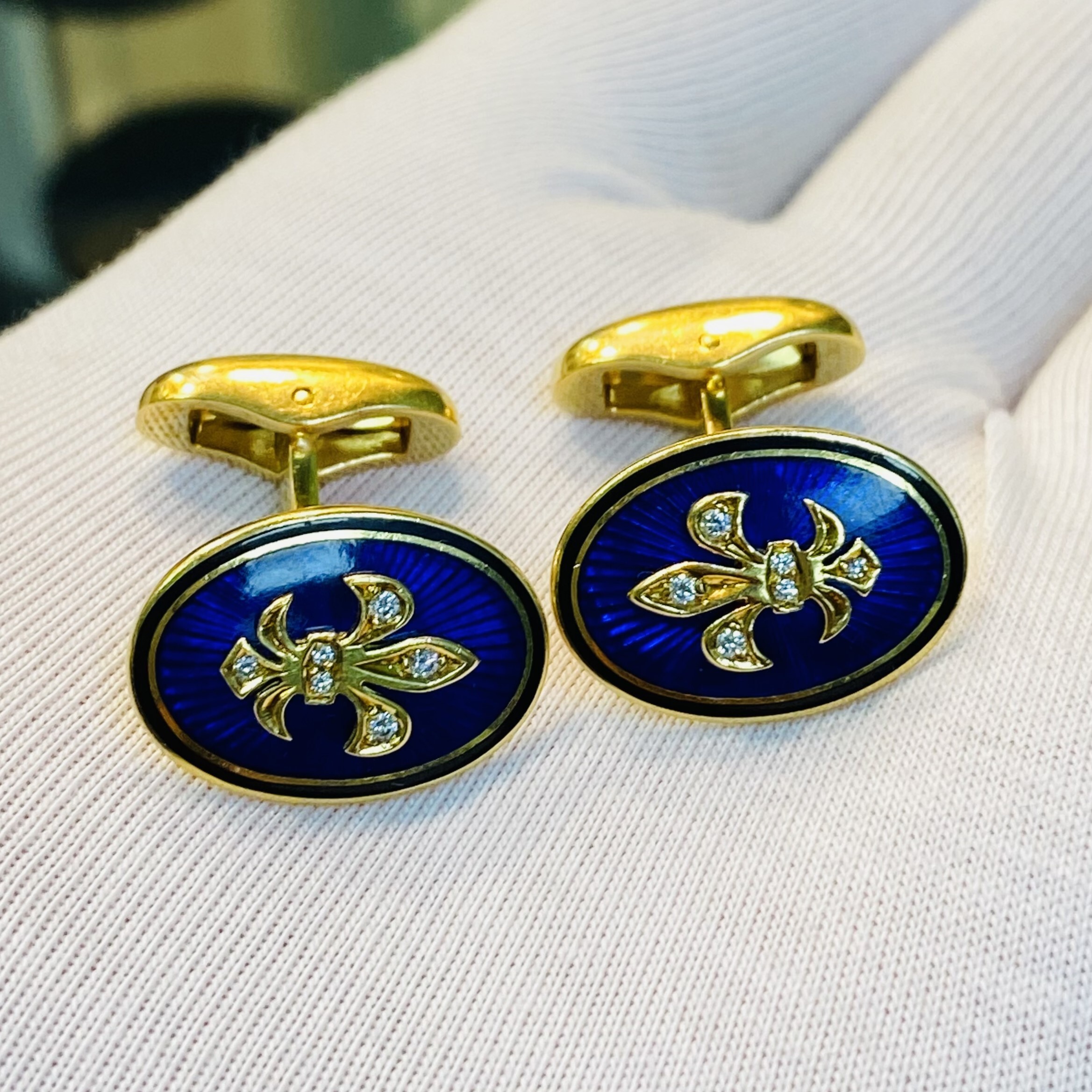 Запонки Faberge из золота 750 пробы с бриллиантами. Эмаль синего цвета, вес 17,14 г.