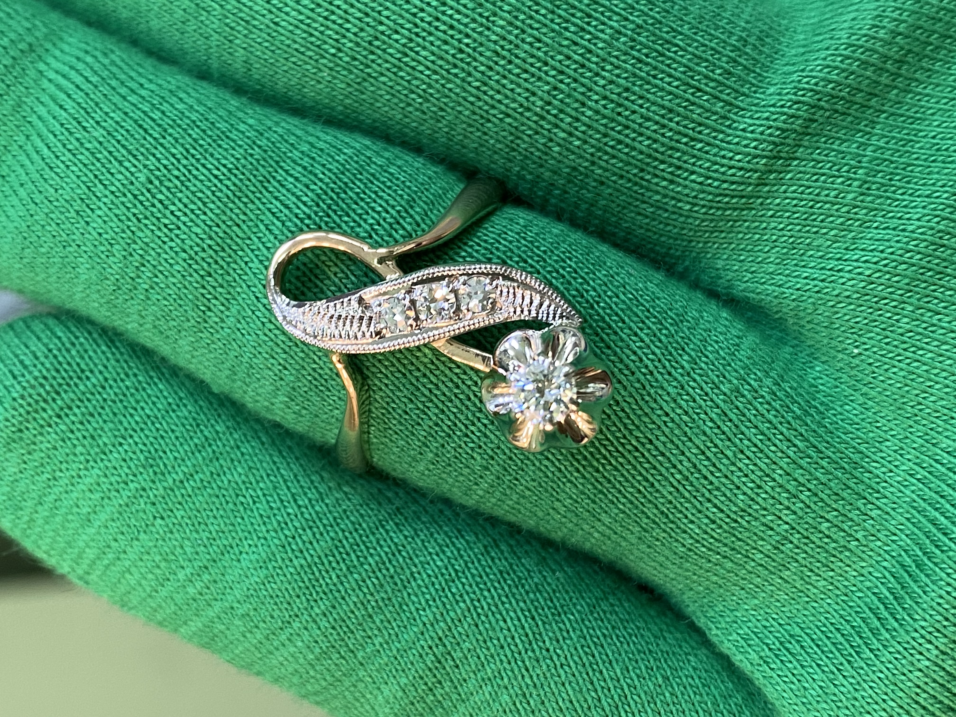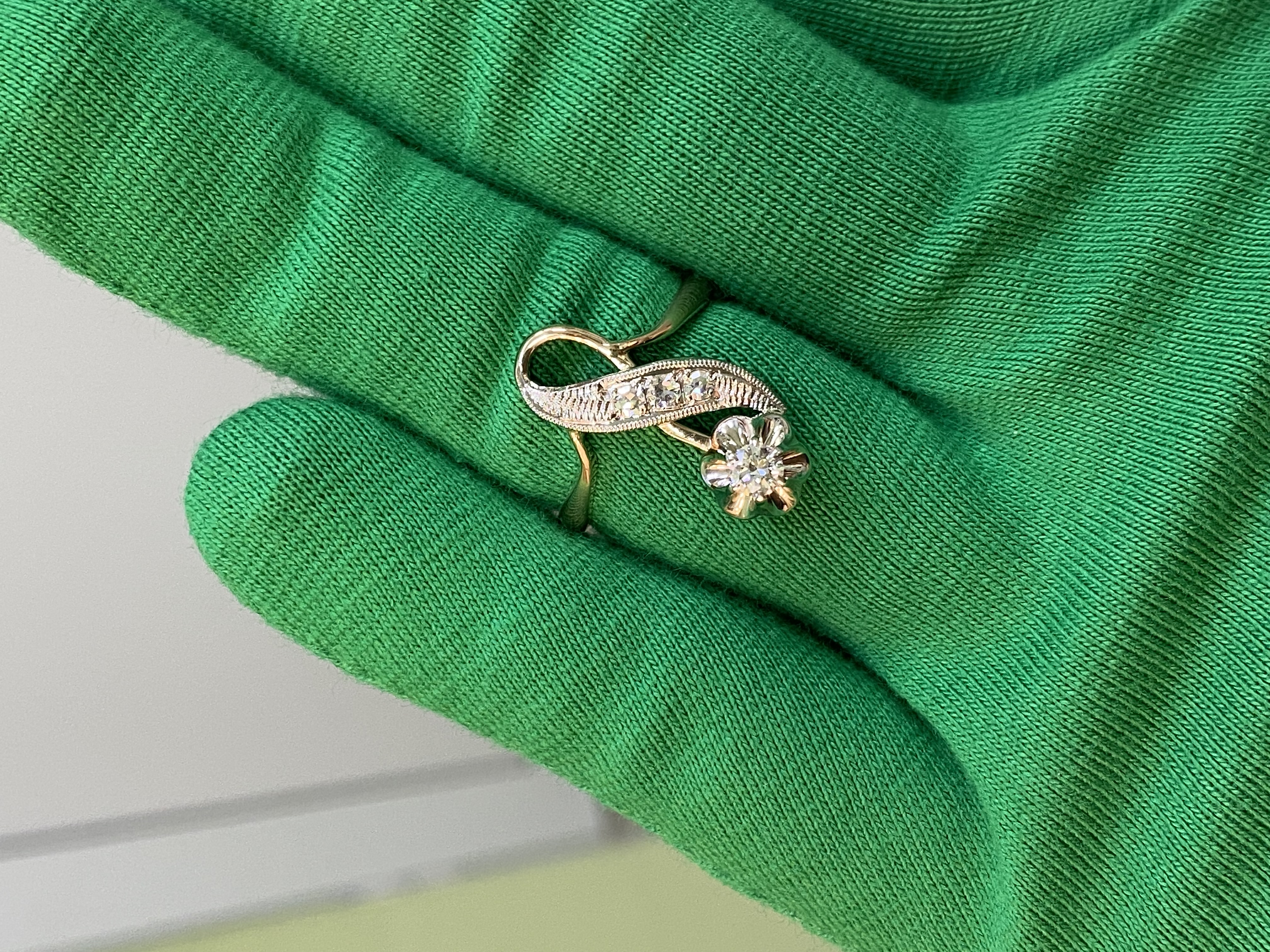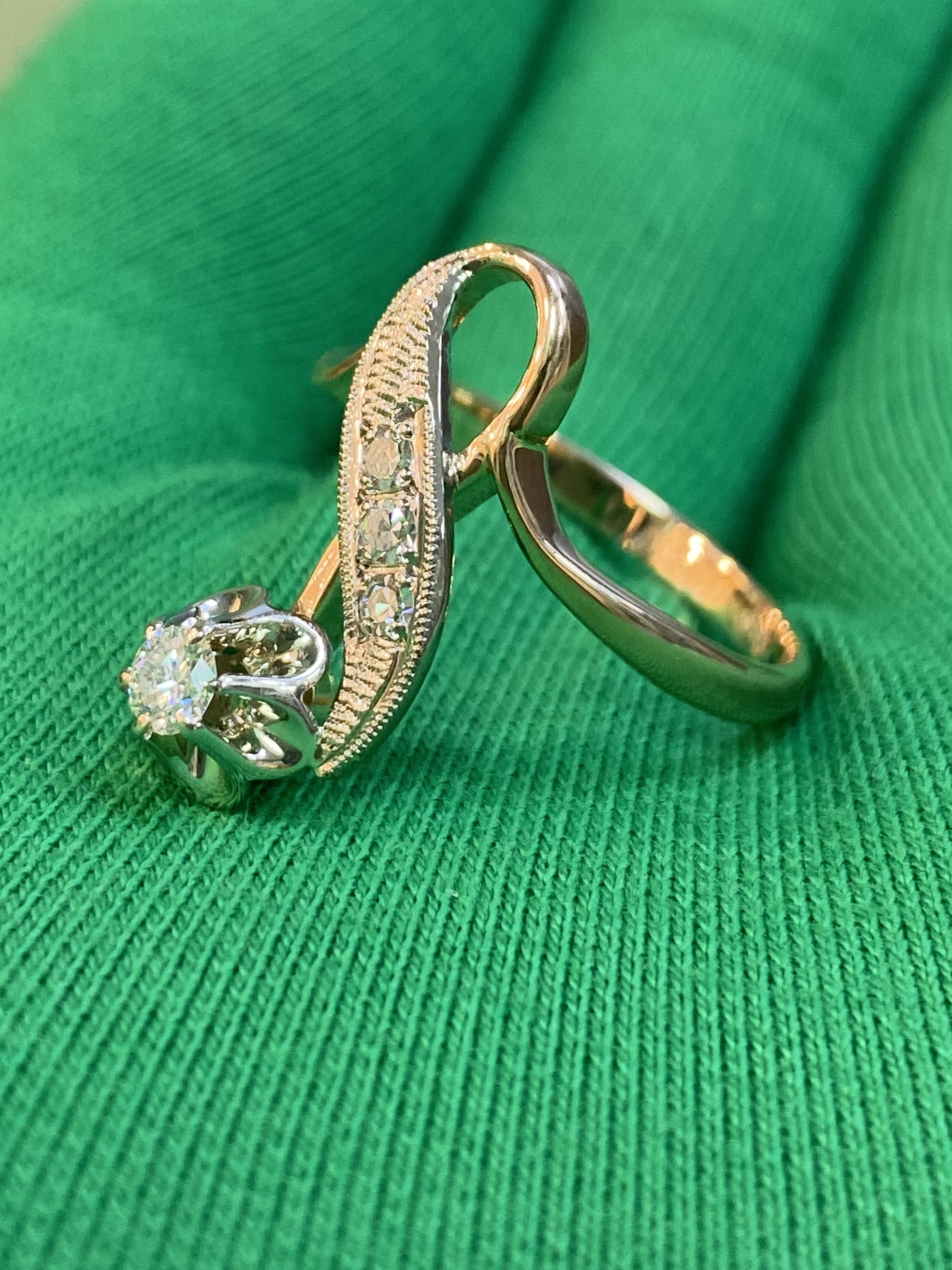 Золотое кольцо 585 пробы розового и белого цвета. Общая каратность не менее 0,25 ct. Размер 18,3. Общий вес: 4,11 г.