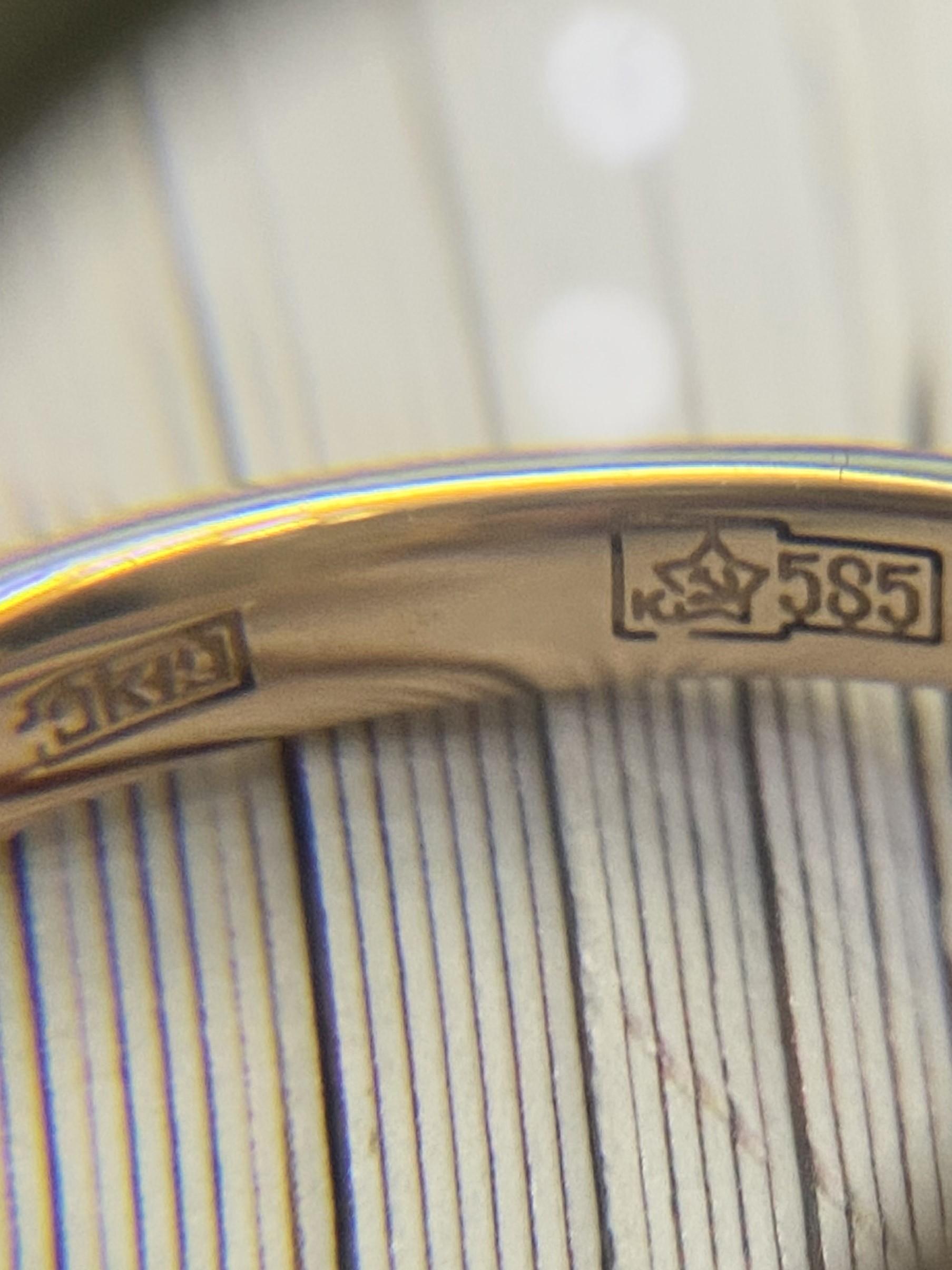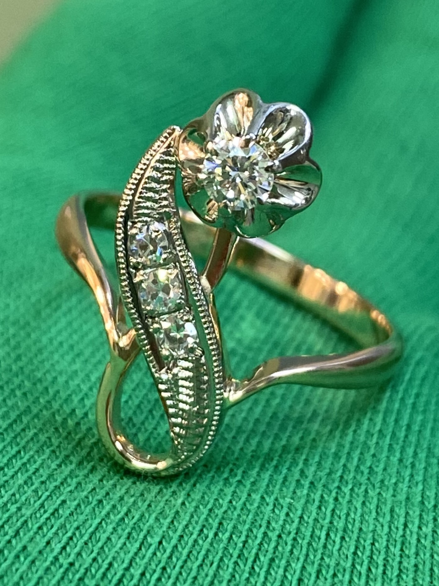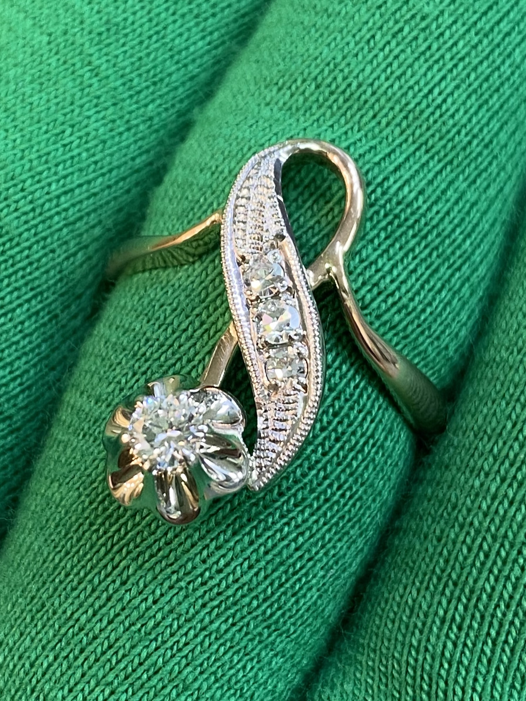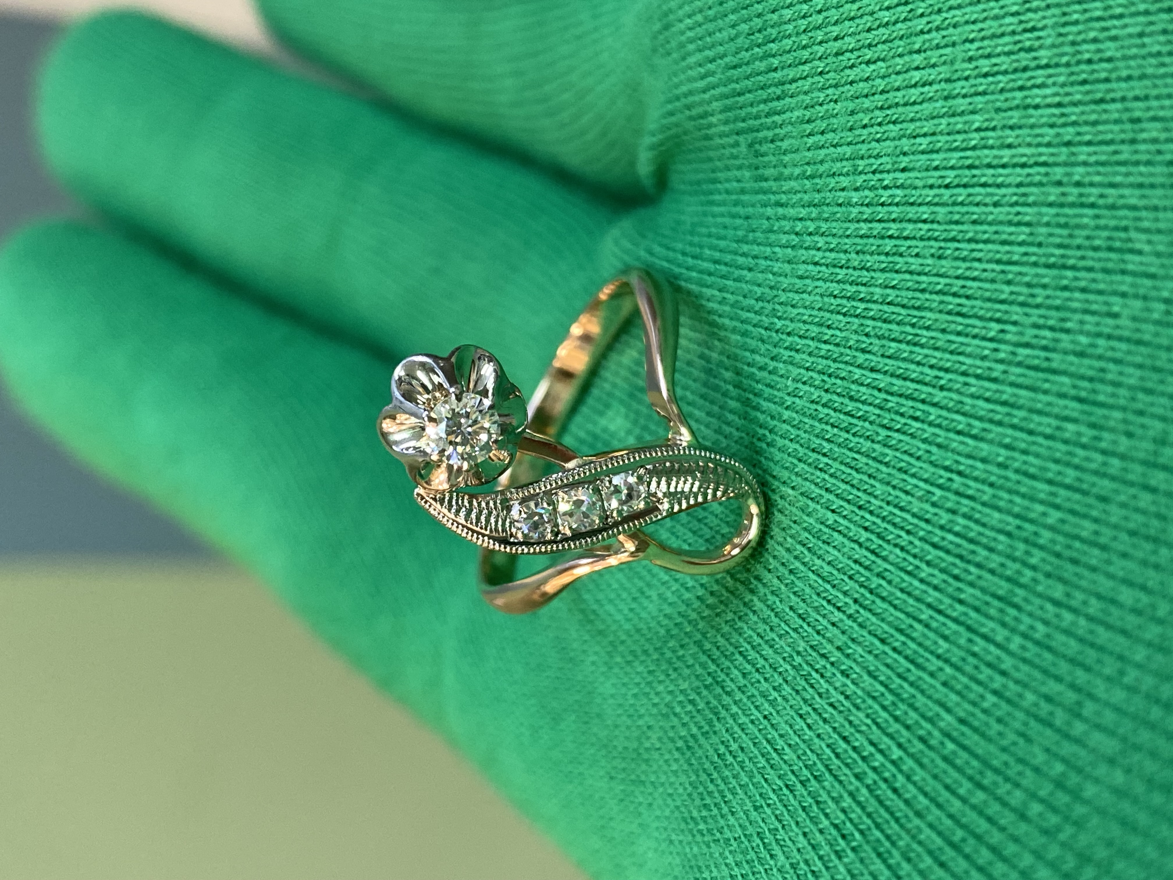 Золотое кольцо 585 пробы розового и белого цвета. Общая каратность не менее 0,25 ct. Размер 18,3. Общий вес: 4,11 г.